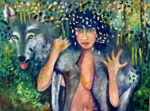 Liefde, woede, lust en passie zijn de motor van het scheppend vermogen. Zonder deze emoties kan Cristina Vaudo niet schilderen. In het figuratieve werk van Cristina staat de mens of de natuur centraal. Schoonheid en verval ondersteunen elkaar in haar werk. In haar grote kleurrijke olieverfschilderijen verwerkt ze de emoties en de gebeurtenissen in haar leven. Haar angst voor de wolf was voor haar de reden om dit schilderij te maken. Angst moet je in de ogen kijken om het te kunnen overwinnen. Naast haar figuratieve werk maakt ze ook abstracten. Haar Italiaanse roots weerklinken in haar warme en zachte kleurgebruik.